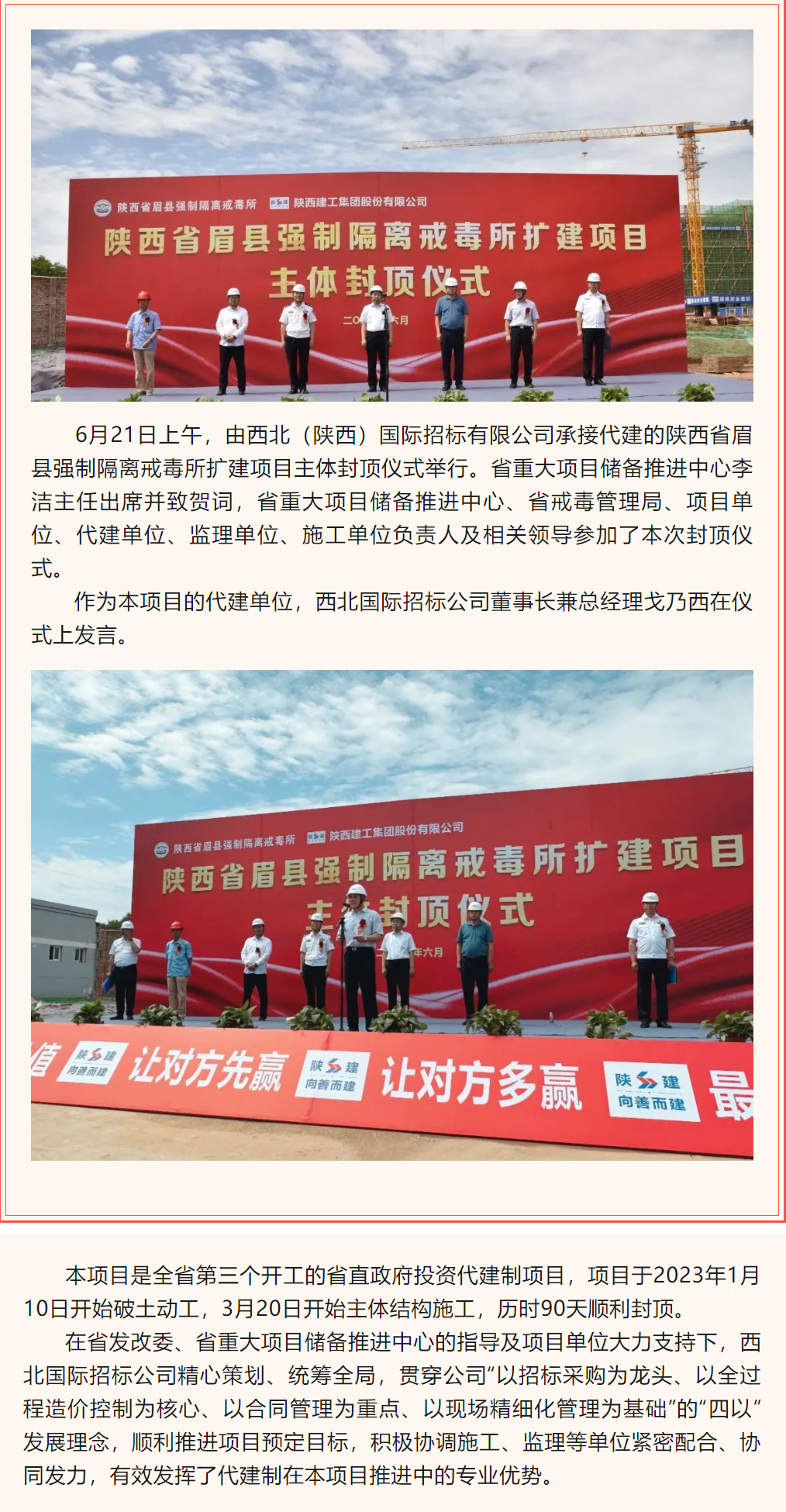 由我公司承接代建的“陜西省眉縣強制隔離戒毒所擴建項目”主體封頂儀式順利舉行