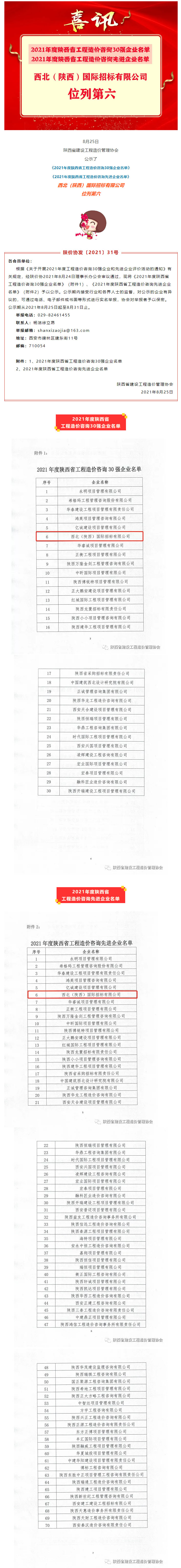 2021年度陜西省工程造價(jià)咨詢30強(qiáng)企業(yè)與先進(jìn)企業(yè)名單公示!我公司位列第六!