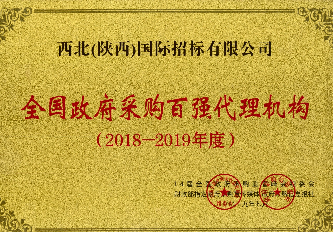 熱烈祝賀西北(陜西)國(guó)際招標(biāo)有限公司榮獲“全國(guó)政府采購(gòu)百?gòu)?qiáng)代理機(jī)構(gòu)”稱(chēng)號(hào)