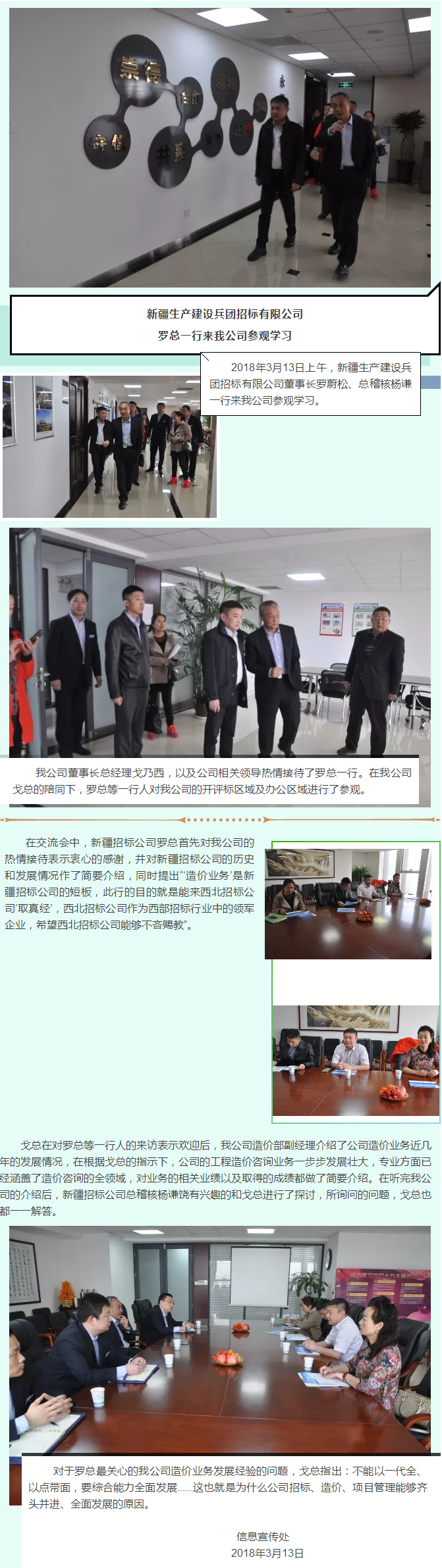 新疆生產(chǎn)建設兵團招標有限公司羅總一行來我公司參觀學習