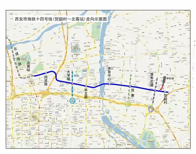 西安地鐵十四號線(最初規(guī)劃為十三號線)為東西走向,規(guī)劃東端起點(diǎn)為國際港務(wù)區(qū)窯村機(jī)場西側(cè),跨灞河后抵達(dá)北客站,與機(jī)場線貫通運(yùn)營。一期工程為賀韶村到~北客站(不含),主要為配合2021年西安第十四屆全運(yùn)會建設(shè)。線路長度約13.8km,依次沿向東路-學(xué)府中路(建材北路)-開發(fā)大道鋪設(shè),共設(shè)賀韶村站~港務(wù)大道站~三義莊站(新增)~雙寨站~體育中心站~辛王路站~學(xué)府路(大學(xué)城)站~尚賢路站車站8座(不含北客站),其中換乘站3座,均為地下站,設(shè)一處停車場(賀韶村停車場),設(shè)主變電所1座(太華北路與學(xué)府中路東北象限)。