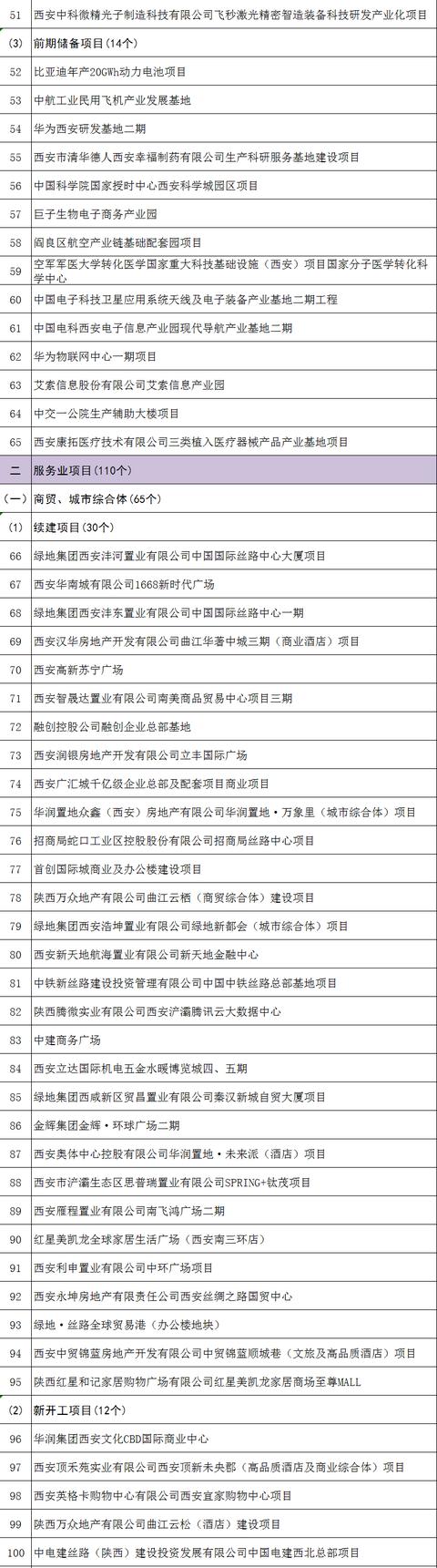 近日,西安市2020年市級重點(diǎn)項(xiàng)目名單發(fā)布。2020年西安市共安排368個(gè)重點(diǎn)項(xiàng)目,其中先進(jìn)制造業(yè)項(xiàng)目65個(gè),包含制造業(yè)項(xiàng)目18個(gè)、戰(zhàn)略性新興產(chǎn)業(yè)項(xiàng)目47個(gè);服務(wù)業(yè)項(xiàng)目110個(gè),包含商貿(mào)城市綜合體項(xiàng)目65個(gè)、物流會(huì)展科技服務(wù)項(xiàng)目45個(gè);文化旅游產(chǎn)業(yè)項(xiàng)目23個(gè),包含文化產(chǎn)業(yè)項(xiàng)目15個(gè)、旅游產(chǎn)業(yè)項(xiàng)目8個(gè);城建及基礎(chǔ)設(shè)施項(xiàng)目50個(gè),包含電力供氣項(xiàng)目7個(gè)、機(jī)場鐵路地鐵道路項(xiàng)目43個(gè);生態(tài)環(huán)保項(xiàng)目29個(gè),包含垃圾處理項(xiàng)目3個(gè)、治水項(xiàng)目21個(gè)、治綠項(xiàng)目5個(gè);社會(huì)事業(yè)和民生保障項(xiàng)目91個(gè),包含教育項(xiàng)目22個(gè)、體育衛(wèi)生項(xiàng)目34個(gè)、老舊小區(qū)改造和背街小巷改造項(xiàng)目8個(gè)、安置房建設(shè)項(xiàng)目23個(gè)、其他項(xiàng)目4個(gè),具體名單如下。