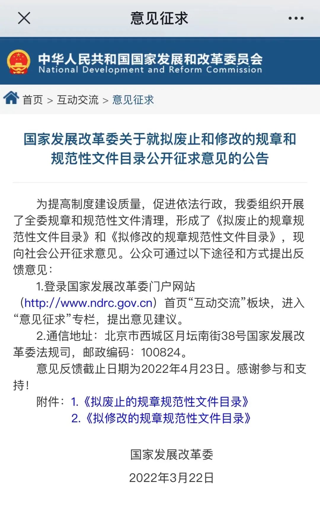 公眾可登錄國家發(fā)展改革委門戶網(wǎng)站(http://www.ndrc.gov.cn)首頁“互動(dòng)交流”板塊,進(jìn)入“意見征求”專欄等方式,提出意見建議。意見反饋截止日期為2022年4月23日。