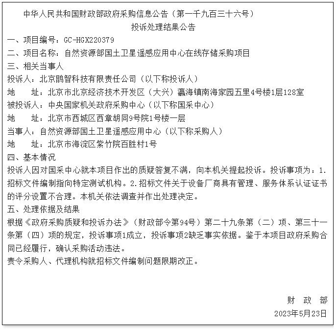 5月30日,財政部發(fā)布1936號政府采購處理意見,涉及項目為自然資源部國土衛(wèi)星遙感應(yīng)用在線存儲采購項目,預算 500 萬元。
